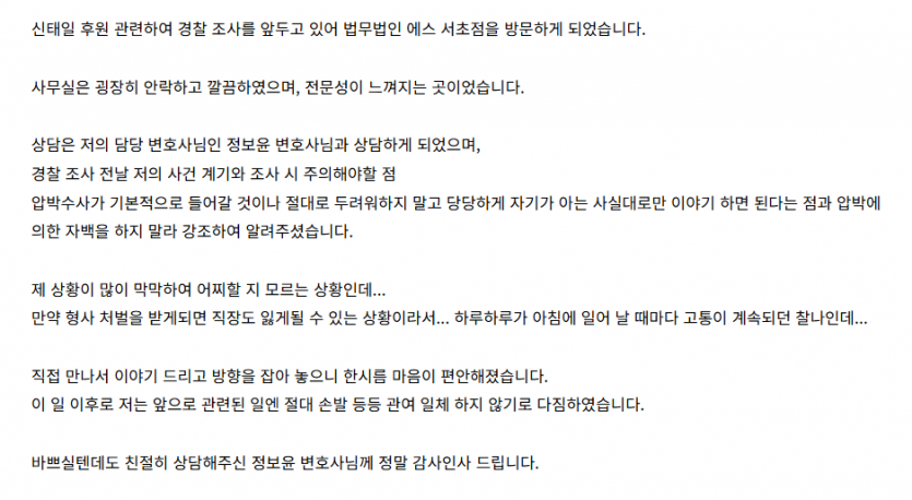 신태일 후원 관련하여 경찰 조사를 앞두고 있어 법무법인 에스 서초점을 방문하게 되었습니다.