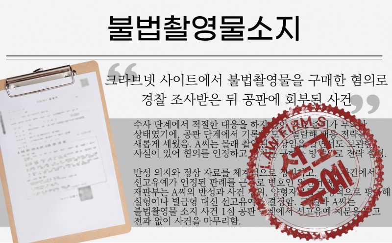 수사 단계에서 적절한 대응을 하지 않아 자료 준비가 부족한 상태였기에, 공판 단계에서 기록을 모두 열람해 대응 전략을 새롭게 세웠음. A씨는 몰래 촬영된 영상임을 알면서도 보관한 사실이 있어 혐의를 인정하고 선처를 구하는 방향으로 전략 설정. |