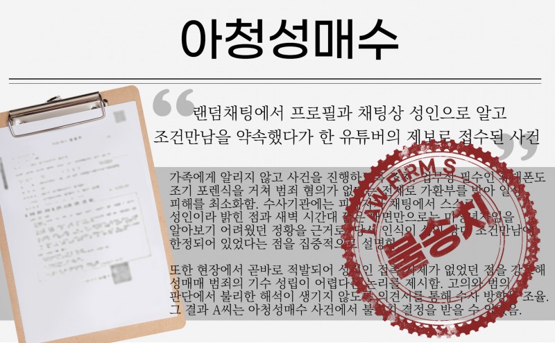 또한 현장에서 곧바로 적발되어 성적인 접촉 자체가 없었던 점을 강조해 성매매 범죄의 기수 성립이 어렵다는 논리를 제시함. 고의와 범의 판단에서 불리한 해석이 생기지 않도록 의견서를 통해 수사 방향을 조율. 그 결과 A씨는 아청성매수 사건에서 불송치 결정을 받을 수 있었음. |