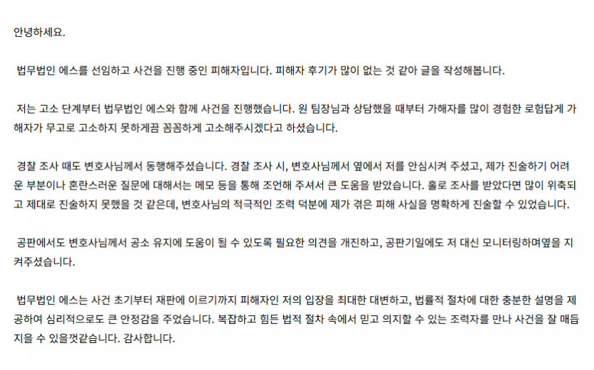 법무법인 에스를 선임하고 사건을 진행 중인 피해자입니다. 피해자 후기가 많이 없는 것 같아 글을 작성해봅니다.