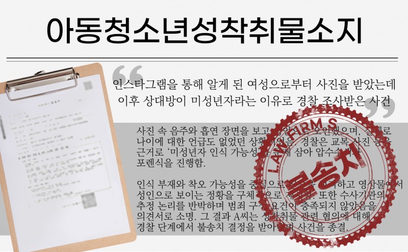 인식 부재와 착오 가능성을 중심으로 진술을 정리하고 영상물에서 성인으로 보이는 정황을 구체적으로 제시함. 또한 수사기관의 추정 논리를 반박하며 범죄 구성 요건이 충족되지 않았음을 의견서로 소명. 그 결과 A씨는 성착취물 관련 혐의에 대해 경찰 단계에서 불송치 결정을 받아내며 사건을 종결. |