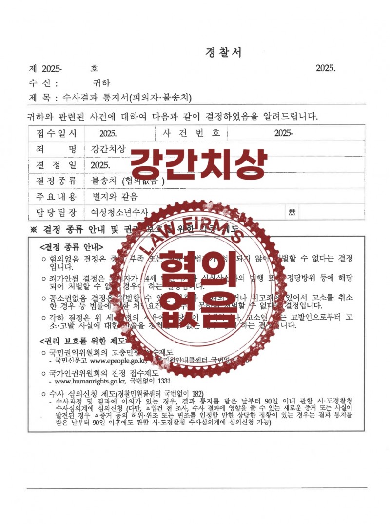 그 결과 수사기관은 폭행·협박에 의한 강제성을 인정하기 어렵고, 상해와의 인과관계 또한 명확하지 않다고 판단했습니다. A씨는 경찰 단계에서 불송치 처분을 받았습니다. 민사와 형사가 동시에 얽힌 위기 상황에서 형사 리스크를 선제적으로 차단한 사례였습니다.